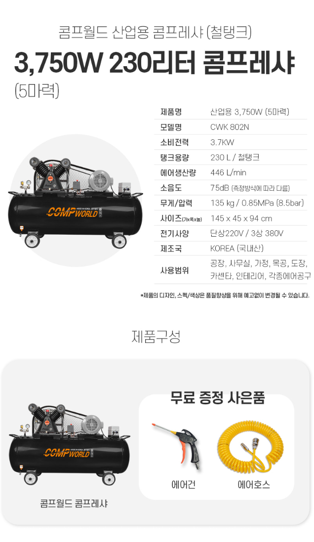아래는 실제 콤프월드 산업용 콤프레샤 CWK-802N 5마력 콤프레샤의 스펙으로 소비전력과 마력을 비교해보시길 바랍니다.