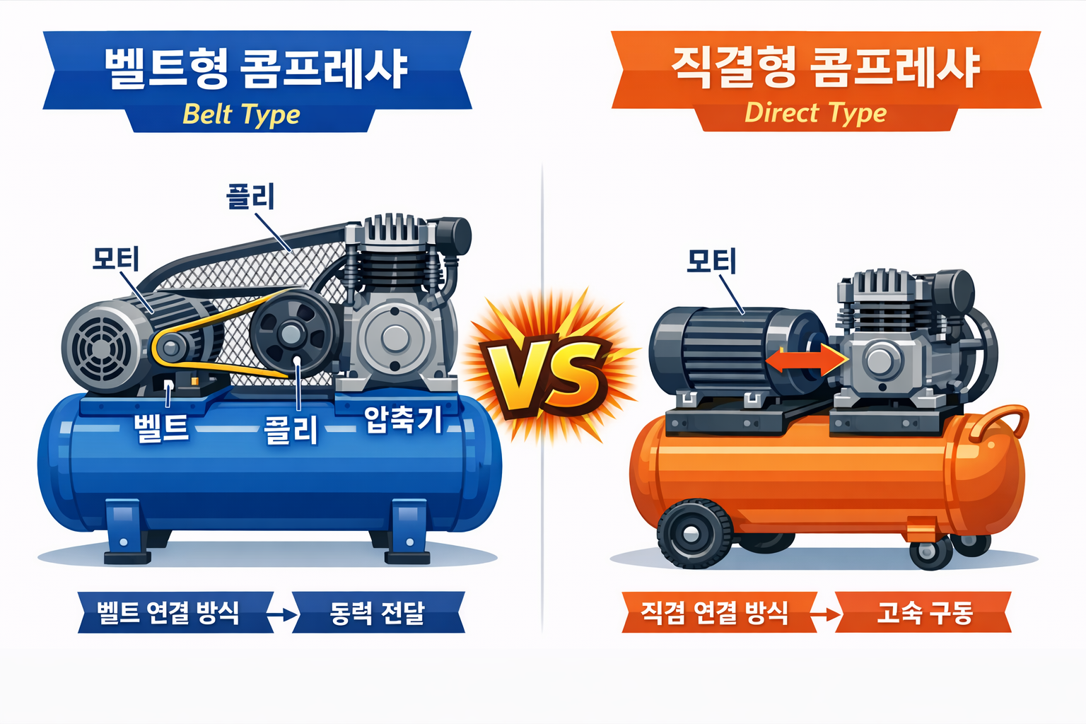 이번 글에서는 벨트형 콤프레샤와 직결형 콤프레샤의 차이를 쉽고 명확하게 비교하고, 어떤 상황에서 어떤 제품을 선택해야 하는지 정리해드립니다.